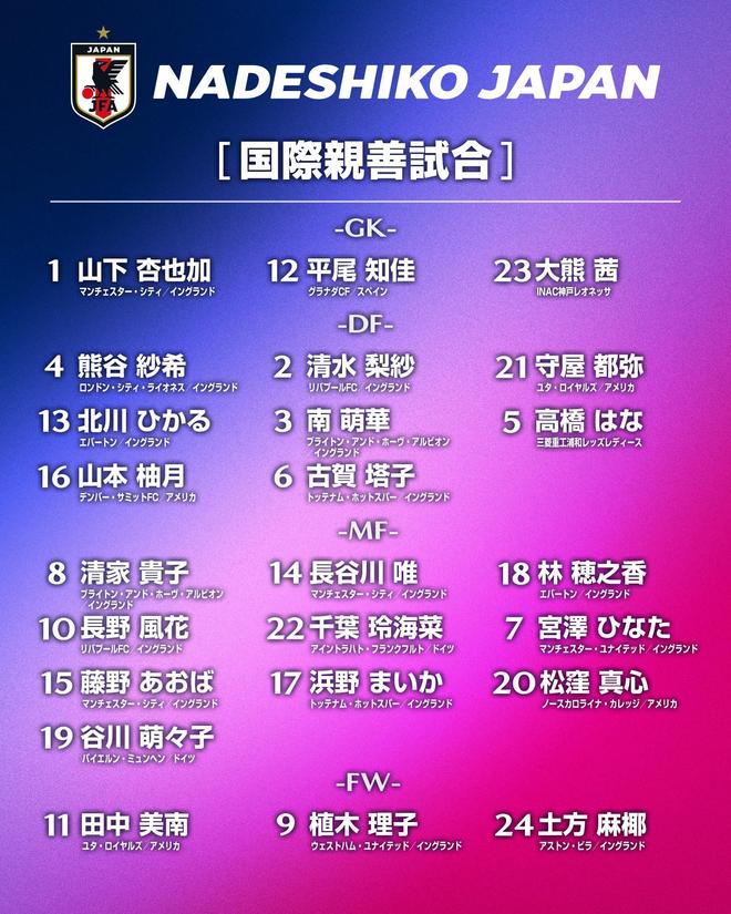 7-宫泽日向(曼联)8-清家贵子(布莱顿)10-长野风花(利物浦)14-长谷川唯(曼城)15-藤野青叶(曼城)17-浜野舞香(热刺)18-林穗之香(埃弗顿)19-谷川萌萌子(拜仁慕尼黑)20-松洼真心(北卡罗来纳勇气)22-千叶玲海菜(法兰克福)